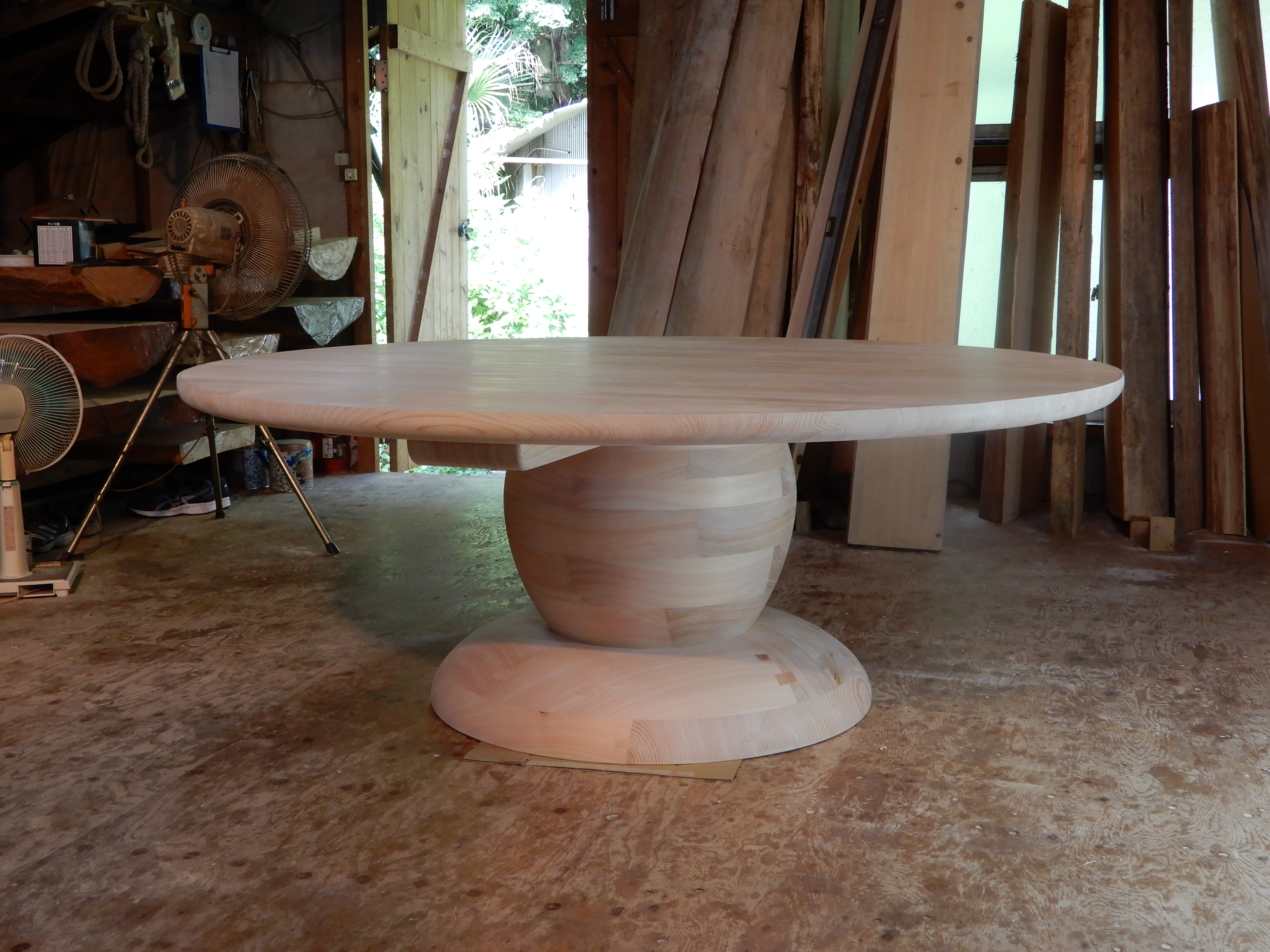 2022年7月14日 新作、タイコテーブル(直径1800)が、出来ました、足元の形が、楽器の和太鼓に似ている事から、