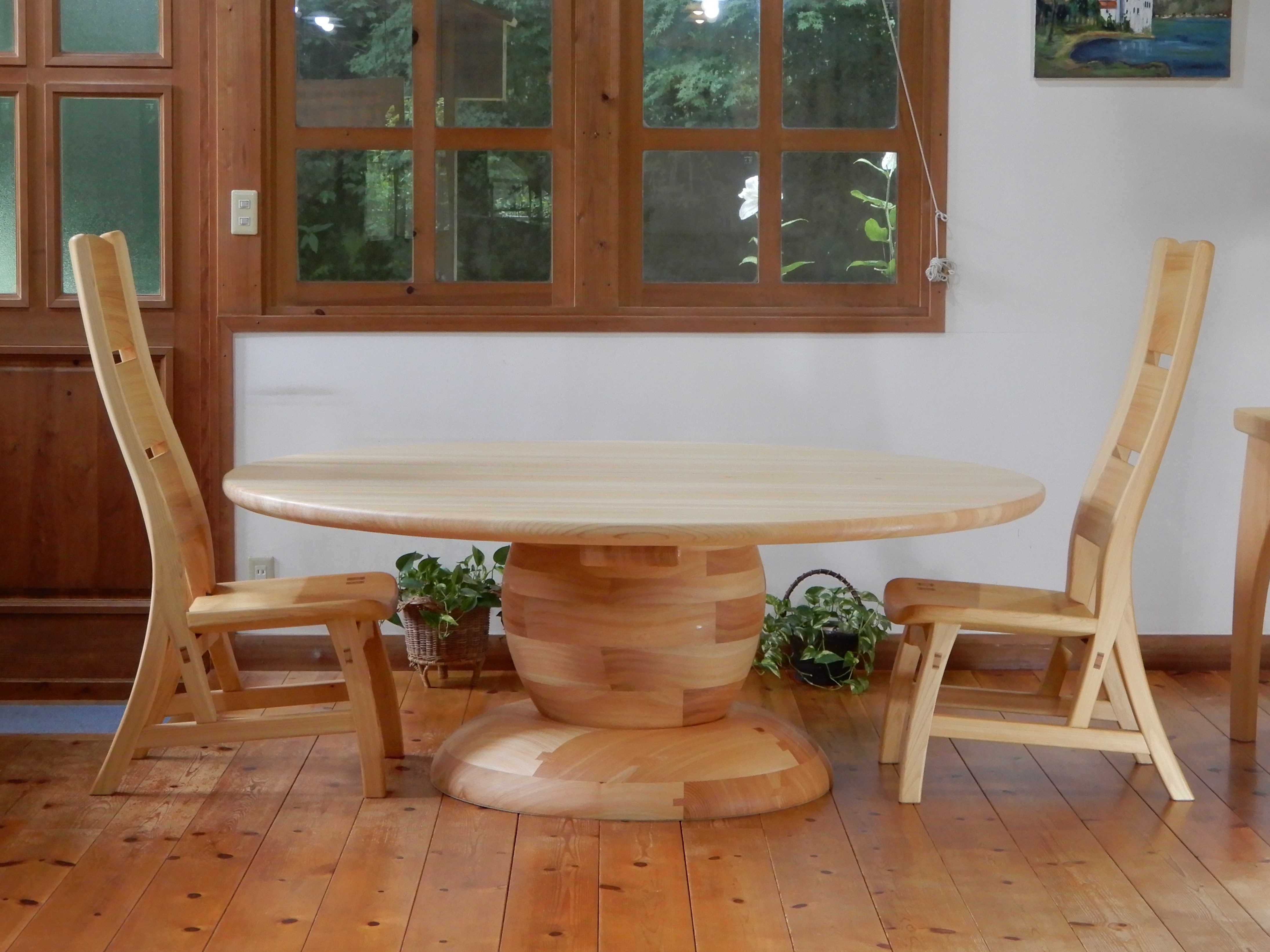 タイコテーブルと名付けました、直径1,4メートルの丸テーブルは小さめの8人掛け、ゆったりサイズの6人掛け、その中間で7人掛けと、