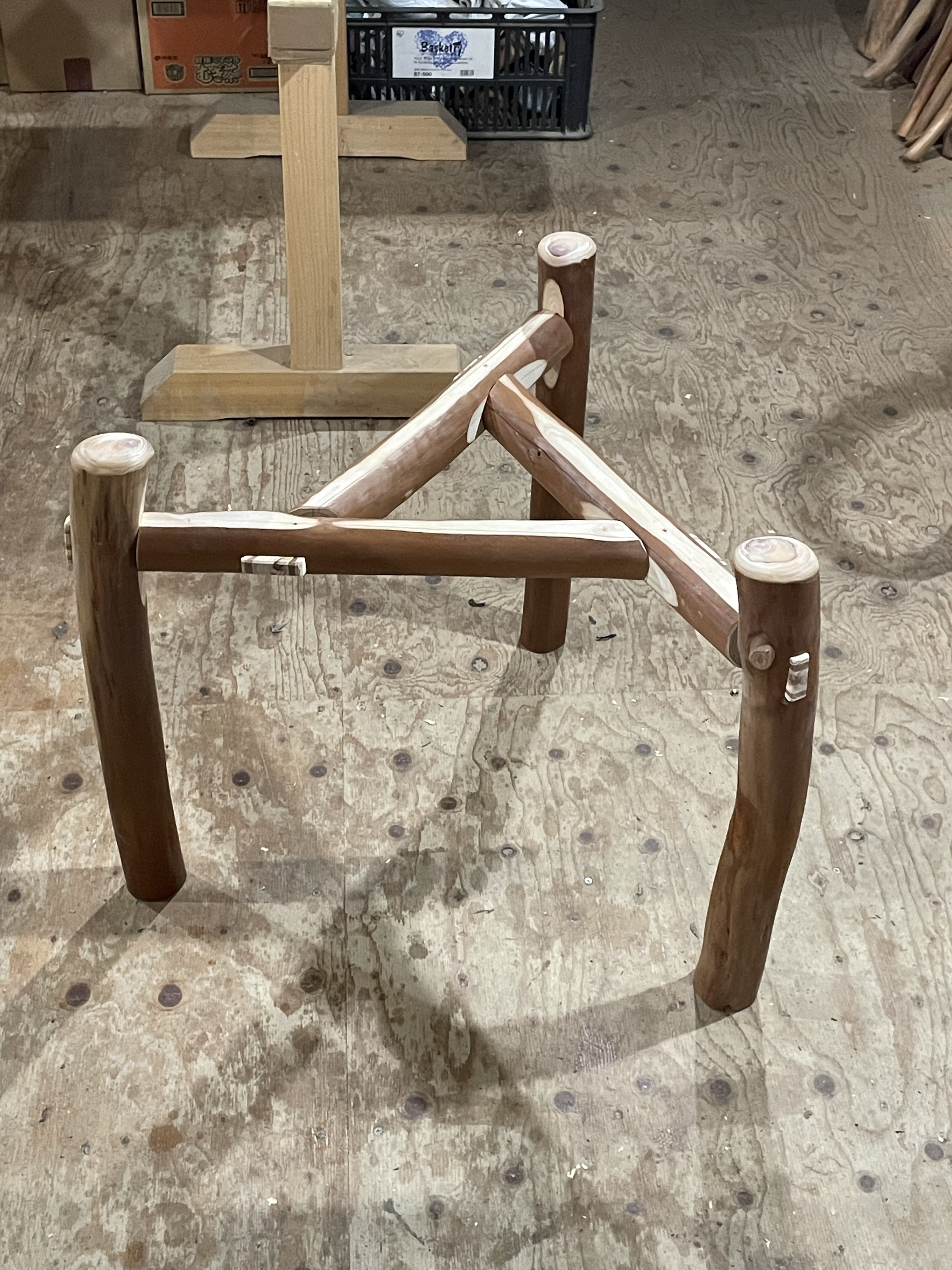 ペーパーコードのスツールの組み立てが終わりました、ヒノキの枝を取り入れるのは、峠の工房の特長ですが、これからは、もっとこの方法を取り入れなくちゃと思っています。 |